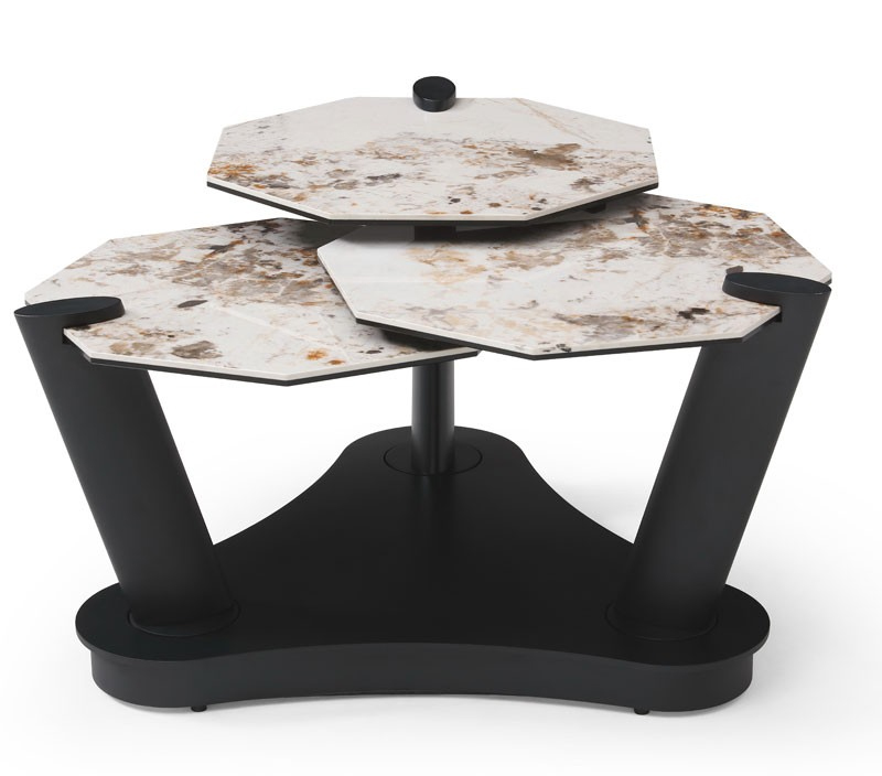 Vous aimez les tables basses résolument contemporaines, généreuses en espace modulaire pour s'adapter à vos envies ? Vous allez craquer pour la cinématique douce de la Table basse DAHLIA céramique Pandora et ses 3 plateaux pivotants en céramique Pandora. Châssis en métal laqué époxy noir, plateau en céramique 6mm sur verre trempé 6mm Céramiques disponibles : Cold Jade, Pandora, Travertin