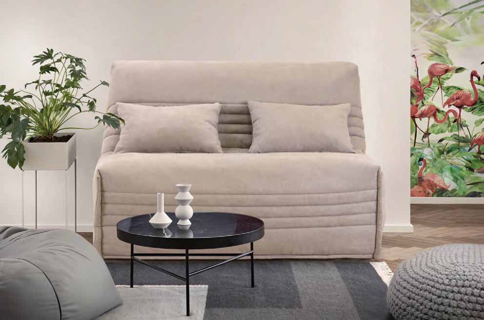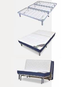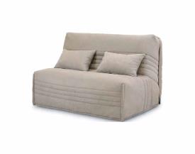 Gruhier Dimensions : l 143 x h 94 x p 106 cm Banquette-lit BZ Couchage 140x200, cadre 24x2 lattes multiplis cintrées blanches largeur 38 mm, époxy gris clair. Charnières métalliques et doubles ressorts de rappel. Matelas tri-bloc BULTEX 15 cm, mousse polyuréthane HR 35 kg/m3, coutil Stretch sur plateau piqué sur mousse contact, plate-bande tricot bleu, garanti 5 ans. Housse de recouvrement : Ouatinage 410 grs/m2, doublure 100% polyester gris, maintien par fermeture à glissière. Option coffre de rangement. Paire de coussins déco déhoussables avec fermeture à glissière.
