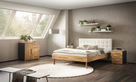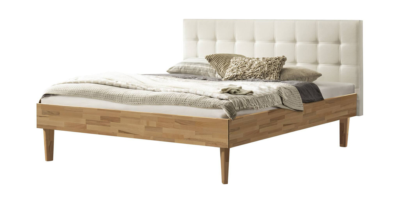 Le lit en bois massif Alcamo se distingue par ses pieds en bois verticaux et coniques qui lui offrent une assise à la fois stable et élégante. Le véritable attrait est toutefois la tête de lit imposante, élégamment ornée de coutures décoratives disposées en carré. Alcamo allie un design intemporel à une finition de haute qualité et devient ainsi un élément phare dans chaque chambre à coucher.