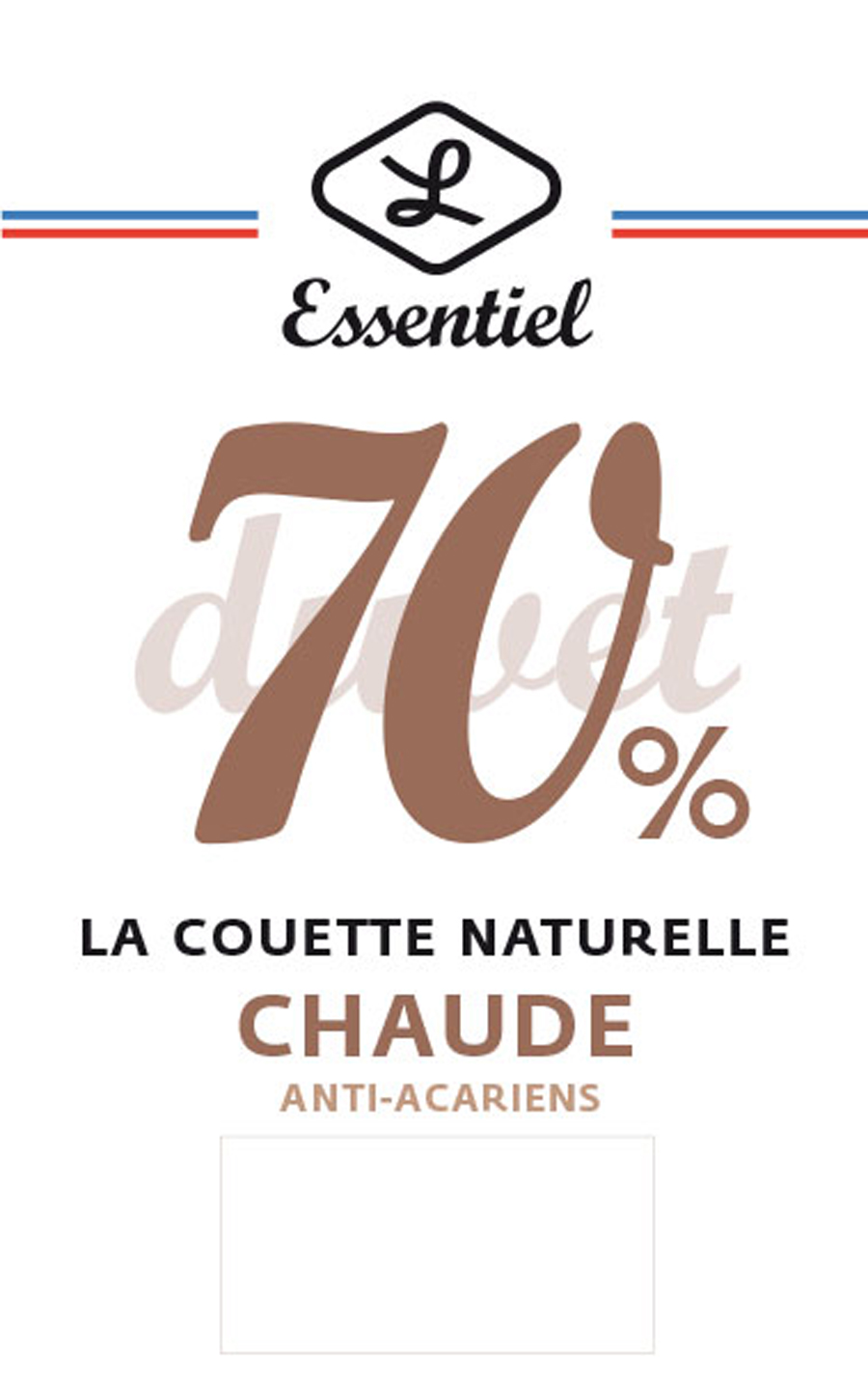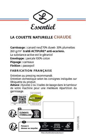Garnissage: 70% duvet de canard blanc neuf traité ACTIPURE anti acariens d’inspiration végétale / 30% plumettes 260g/m²