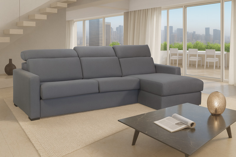 Mondosofa Le canapé-lit d'angle BL012 allie élégance et fonctionnalité en un seul meuble. Dimensions : l 272 x h 85/100 x p 100/155/210 cm Revêtu d'un tissu durable, il offre un grand espace grâce à sa configuration chaise-longue. C'est la solution idéale pour ceux qui recherchent le confort pendant la journée et la praticité pendant la nuit, car il est équipé d'un système de lit intégré et d'un compartiment de rangement. STRUCTURE: bois at dérivés REMBOURRAGE: polyuréthane expansé à densités diversifiées (densité assise: 30 kg/m3, densité dossier: 21 kg/m3) REVÉTEMENT: tissu ou cuir SYSTÈME-LIT: sommier ólectro soudé double pliage avec matelas H14 cm en tissu jacquard/stretch PIEDS: plastique, bois ou métal canapé lit angulaire