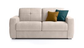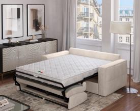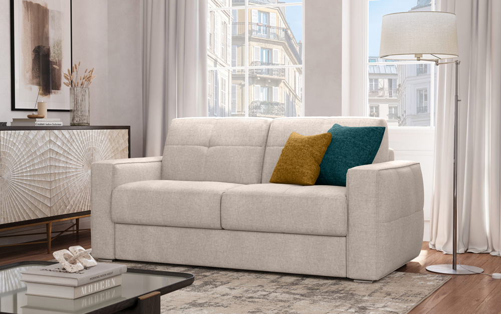 Équipé d'un matelas de 14 cm de hauteur, il présente un design linéaire et compact et s'intègre facilement dans n'importe quel environnement, tandis que le mécanisme d'ouverture simple et fluide permet de passer rapidement du canapé au lit.