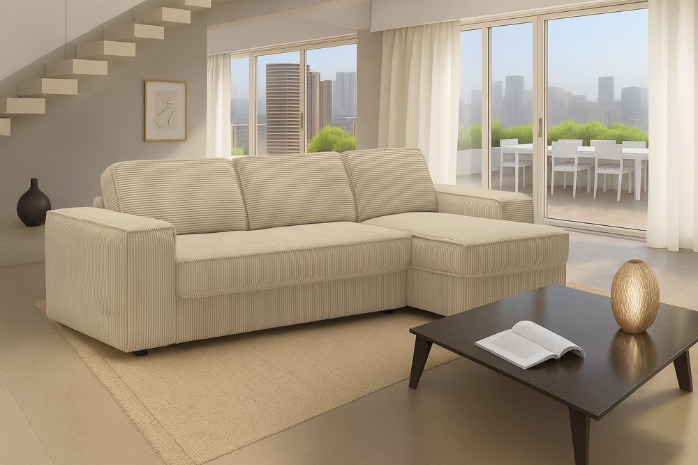 Grâce à sa configuration d'angle, il offre un grand nombre de places assises pendant la journée et se transforme facilement en un lit confortable pour la nuit. Son design discret, son revêtement en tissu et son mécanisme dissimulé en font la solution idéale pour les salons contemporains qui requièrent de la polyvalence sans sacrifier le style.