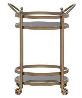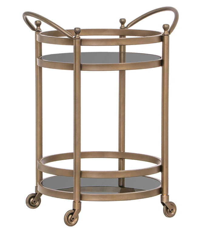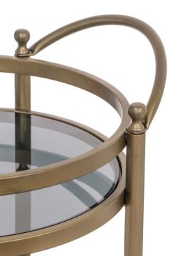 Trolley Hendricks laiton (Brushed Gold) - Réf. 9425 Dimensions : l 55 x h 74 x p 45,5 cm Caractéristiques Matériau : fer, verre, aluminium Couleur : Brushed Or Poids brut : 16,9 kg