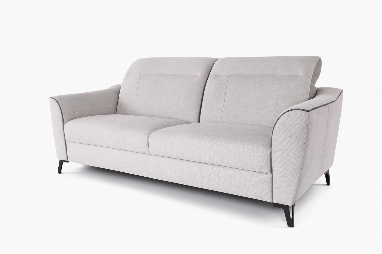 Sourice Dimensions : l 116/... x h x p cm STRUCTURE Carcasse en hêtre massif et structure panneaux de particules SUSPENSION Ressorts type nozag GARNITURE Assise mousse HR type bultex densité 45 kg/m3. Dossier mousse HR type bultex densité 25 kg/m3. Têtière réglable à crémaillère, intérieur surjeté pour éviter l’effilochage. Finition en surpiqûre. Mécanique près du mur uniquement électrique dégagée du sol avec un long repose pieds. canapé 2,5 places