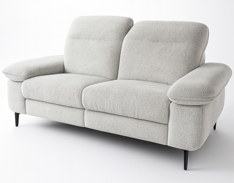 Sourice Dimensions : l 115/... x h x p cm STRUCTURE Carcasse en hêtre massif et structure panneaux de particules SUSPENSION Ressorts type nozag GARNITURE Assise mousse HR type bultex densité 45 kg/m3. Dossier mousse HR type bultex densité 25 kg/m3. Têtière réglable à crémaillère, intérieur surjeté pour éviter l’effilochage. Finition en surpiqûre. Mécanique près du mur uniquement électrique dégagée du sol avec un long repose pieds. canapé 2 places