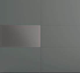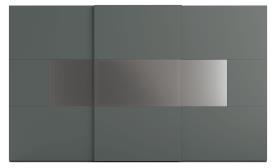 Finitions photo / Portes coulissantes et caisson laqués pierre ponce mate 152, inserts centraux en verre Stopsol, moulures et poignées intégrées en métal anthracite 160. Finition intérieure en alpaga texturé.