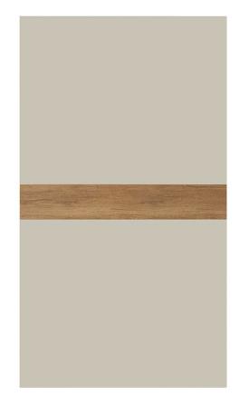 Portes coulissantes en laque mate nacre 124, bandeau en chêne texturé traité thermiquement et poignée Clip. Structure lactée opaque nacre 124.